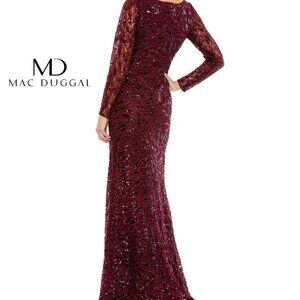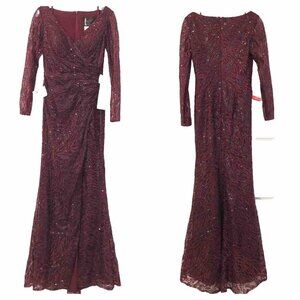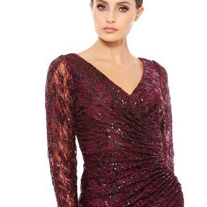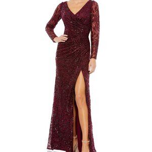 NEW MAC DUGGAL Long Sleeve Sequined Lace Ruched Formal Evening Garnet Gown $698