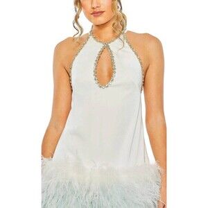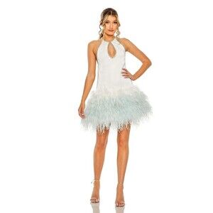 tart your night out right with a stylish dress from Mac Duggal 11437. Tailored in a baby doll silhouette, this dress has fun and playful style throughout. Boasts a big keyhole front in the halter neckline and sleeveless bodice. Has crystal beadings to outline the neckline which extends to the back. Ending its beauty with a fancy feather-embellished hem in a light blue/silver color.