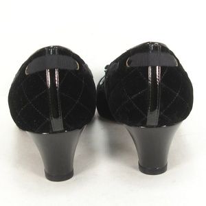 Description: Quilted velvet slip on round toe classics pumps shoes, patent leather cap toe, covered heels and trim around top hem, brass tone metal grommets with a satin ribbon and front bow, leather lining. Made in Italy