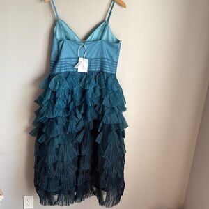 Teal, multicolor gown featuring a mesh bodice, pleated accents decorate the layers