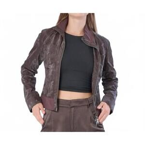 Step into timeless elegance with the Etna Sueded Patent Leather Bomber Jacket by Marrakech, a perfect blend of heritage and high style in Black Coffee. This long-sleeve jacket, made from 100% polyurethane with a smooth 100% cotton lining, features a chic zip closure and utility-inspired pockets for retro appeal. The ribbed collar and waist enhance easy layering, while the snap-button cuffs offer flexible styling. With a center back length of 21", this jacket provides a comfortable fit ideal for everyday wear. Model is 59.5" and wearing a size small.