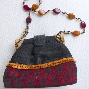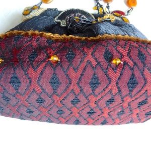 NEW WITHOUT TAGS MARY FRANCES EVENING/ DRESS BAG..BEADED SHOULDER STRAP ..Gold lining..snap closure..fabric in multitones..black beaded tassel..beautiful! 7" x 9" , 12 drop strap...