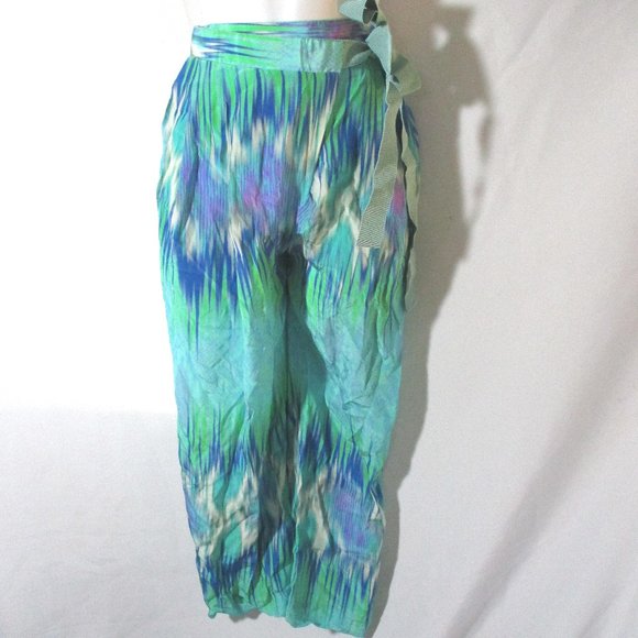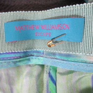 BOLD! From the estate of one of this country's top fashion buyers with INCREDIBLE LUXURY tastes, stunning NEW MATTHEW WILLIAMSON ESCAPE 100% silk cropped / ankle pants, size 10. Design is "blue snake" in AQUA. Measures approx 32" waist, 23" inseam, 42" hips, 14" leg opening. Perfect for industrial / cyberpunk / steampunk / goth / rocker / emo / cosplay fashionista! Psychotic Leopard says, "Be spotted!"