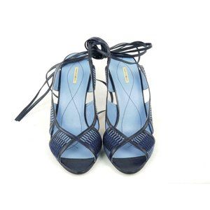 Elegant women's MAX STUDIO strappy stiletto wraparound heels. Size 9 M. Uppers are made of paneled fabric in shades of blue with navy leather trim. Thin leather strap closures that tie around the ankles and calves. 4 inch stiletto heels. Comfortable insoles. New, but have been tried on.