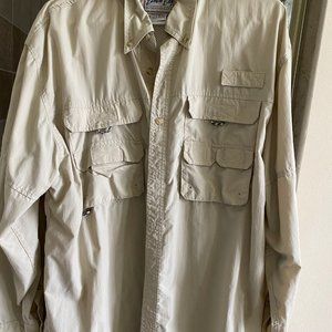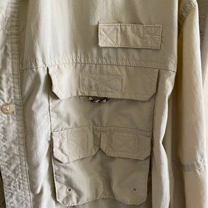 MENS BIMMI BAY OUTWEAR LONG SLEVE WEATHER SHIRT IN BEIGE NO STAINS RIPS PULLS FROM NON SMOKING HOME HAS TWO FRONT POCKETS BUTTON DOWN HAS AWESOME COOLWAY OPENING IN BACK OF SHIRT in Great new condition ready to wear will keep you cool and dry great for fishing