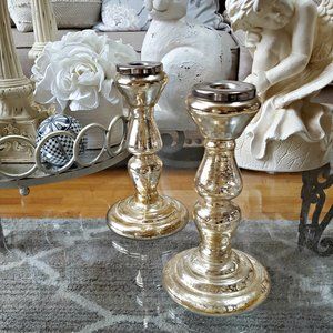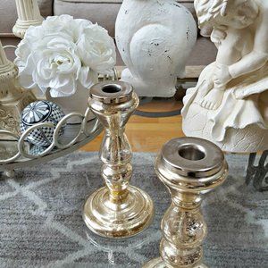 New and the only set I have of this beautiful pair of mercury glass candle holders. Each holds a taper. Each measures 4 1/4" at base x 8" high. Perfect pair to add to a collection. Place on a mantle, entry table and more. There is a 5 lb max limit AFTER packing materials and box for 7.97 shipping rate. PRICE REFLECTS PACKING MATERIALS SUCH AS A MOVING BOX, BUBBLE WRAP, PACKING MATERIALS AS WELL AS POSH'S 20% FEE. DISCOUNTS ARE OFFERED ON 3 OR MORE ITEMS PER SALE EVEN IF SPLITTING BUNDLES. Smoke free ty for poking in my closet xo WE PACKAGE ALL FRAGILE ITEMS WITH THE UTMOST CARE AND QUALITY PACKING MATERIALS. ENJOY SHOPPING AND BUY WITH CONFIDENCE ~~ Best Lori