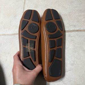 Brand new, never worn, still in the box Michael Kors flats in cognac leather. Gold MK logo on front of shoe! Bought but never worn since I’m in healthcare and spend my days in sneakers! Paid $115