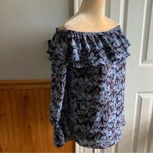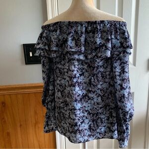 Elevate your style with this chic off-shoulder top. Featuring a beautiful floral pattern in blue and black, it's perfect for any occasion.