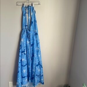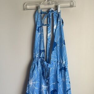 This is a light blue halter-style maxi cover-up dress featuring a deep plunging neckline and an adjustable tie-front closure. The flowy fabric is adorned with a bold, oversized floral print in darker blue shades, creating a tropical, beach-ready vibe. The front slit adds a breezy, elegant touch, making it perfect for layering over swimwe