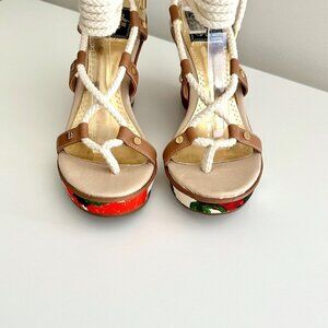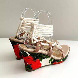 Details: designer collaboration, floral design, bold red, greens and ivory, ivory (off-white) rope lace up ankle wrap closure w/goldtone metal tips, medium brown leather/goldtone hardware accent, metallic gold leather insoles w/fabric designer logo, partial fabric footbed, approx. 4" wedge heels (to footbed), rubber soles w/designer logo. Note: small stain on left shoe insole near back of heels (last pic).