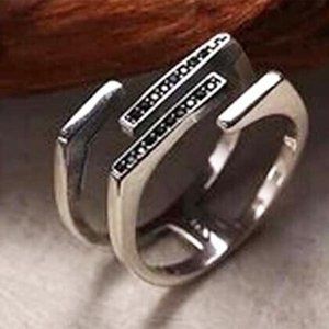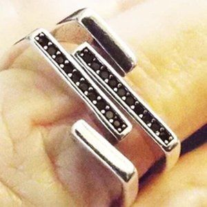 *NEW MINIMALIST SILVERY FOUR BYPASS RINGS W/ BLACK CRYSTALS SZ. 6 RING 67