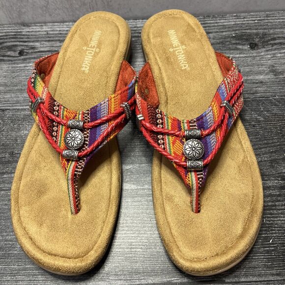 These are Minnie Tonka flip flop sandals in a colorful Aztec design, size 9 for women. They feature a slip-on style with a low flat heel for comfort. The sandals are made of man-made materials and have a thong design.