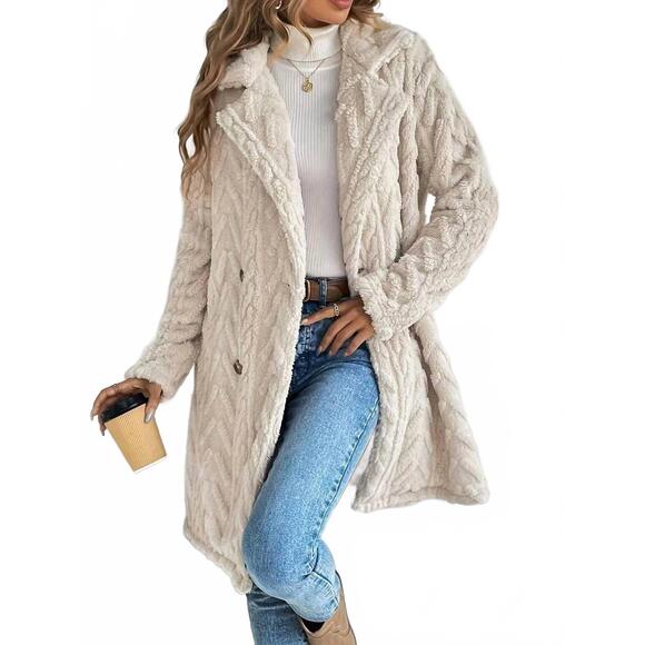 Introducing the Houndstooth Pattern Fleece Coat by Miss Sparkling, a fashionable blend of comfort and style in a chic cream shade. This long sleeve coat features a button closure and a v-neckline, perfect for adding a touch of elegance to any vacation-ready look. Care for this monochrome masterpiece with dry cleaning, ensuring it remains a staple in your fall wardrobe. Embrace the textured pattern and relax in style this Thanksgiving season, enjoying the luxurious feel of fleece.