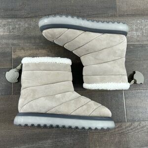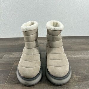 Moncler's suede boots are lined in off-white shearling, ensuring softness on the inside. Designed in an ankle silhouette, they're quilted for comfort and have leather logo tags at the back. The serrated rubber soles ensure traction and grip.
