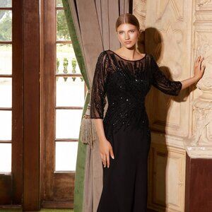 This Mother of the Bride satin dress features exquisite sequin embroidery, adding a subtle touch of glamour and sophistication. The 3/4 sleeves provide elegant coverage, making it a perfect choice for a refined and timeless look.