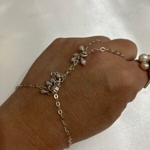 This elegant hand chain features a delicate silver design adorned with beautiful pearls. Perfect for adding a touch of sophistication to any outfit.