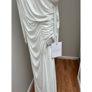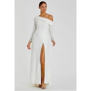 New with tags from Mac Duggal White Beaded Cuff Drop Shoulder Faux Wrap Gown