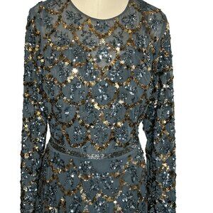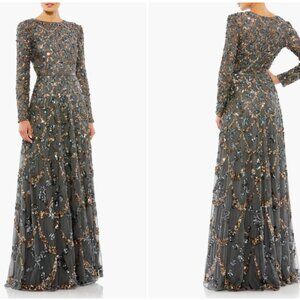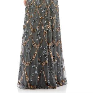 NEW Mac Duggal 5496 Beaded Sequin High Neck A Line Gown Dress Charcoal Gold