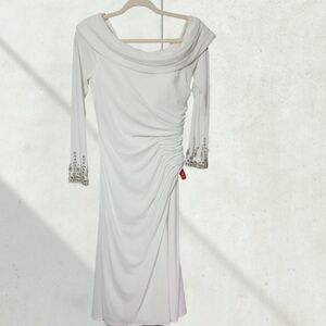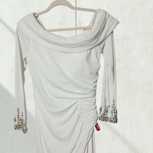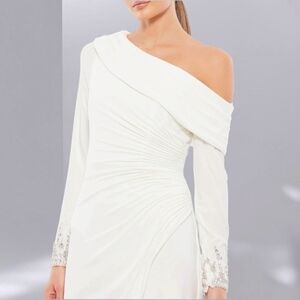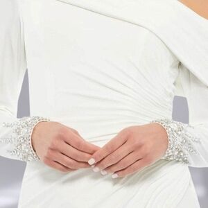 One-shoulder long sleeve midi dress with flattering ruching at the waist, jewel-accented cuffs, and a daring thigh-high front slit.