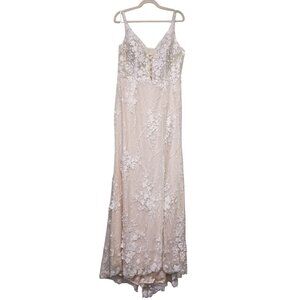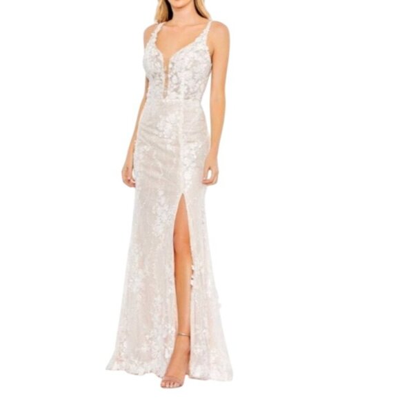 Keywords: wedding gown, evening dress, Mac Duggal, floral applique, ivory dress, size 12, formal wear, bridal gown, lace-up dress, column dress, mermaid dress, glitter gown, sleeveless dress, high slit dress, plunging v dress, prom dress, formal gown, gala
