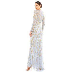 NEW! Mac Duggal Platinum Silver Gold Paisley Beaded Long Sleeve Gown SZ 6