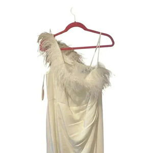 NEW Mac Duggal White Feather Trim One-Shoulder Cocktail Midi Dress Size 12 $298