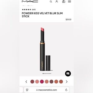 MAC's Powder Kiss Velvet Blur Slim Moisturizing Matte Lipstick delivers lasting mega-matte color along with moisturizing lip balm benefits. Its moisture infused lipstick formula brings on 12 hours of on-trend, intense color, ultra-weightless wear and lip hydration in a single, velvet-soft swipe.