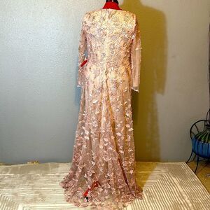 Rose pink gown. Sweetheart neck with illusion lace panel. Lined except sleeves. See photos of measurements for accurate sizing. All measurements are approximate