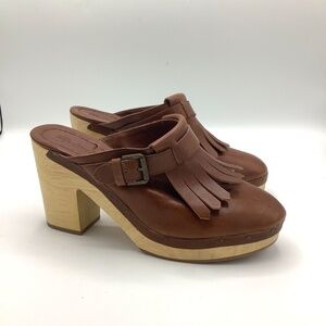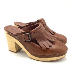 Classic boho Madewell clogs in gorgeous & rich Dark Chestnut brown leather with kiltie fringe & buckle accent.