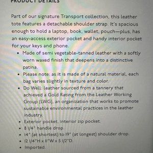 Leather bag get better with time! Has its shape and holds so much- I have a similar Madewell tote in black that has is still in great shape after everyday use for 7 years, including carrying textbooks, laptop, and used as carry on. ***This one is unused***