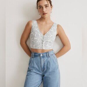 NEW Madewell Softdrape Gwen Linen Floral Button Front Crop Top Gray White 00