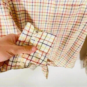 Description: A borrowed-from-the-boys shirt designed to be tied at the waist. Add a pop of playful color to your wardrobe with this Madewell Tie-Front Shirt in Rainbow Plaid. Made from airy, breathable cotton, this cheerful button-down features a relaxed fit, classic collar, and a front-tie hem for a casual-chic look that flatters every shape. Cropped fit. Whether you're heading to brunch or styling it for a laid-back workday, this shirt is your new go-to for effortless style. Pair it with high-rise jeans, denim cutoffs, or a breezy skirt—this versatile piece does it all!