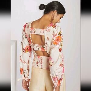 Chic floral blouse by Maeve. Features vibrant pink and cream tones with back cutouts and bow tie sleeves. Perfect for any occasion.