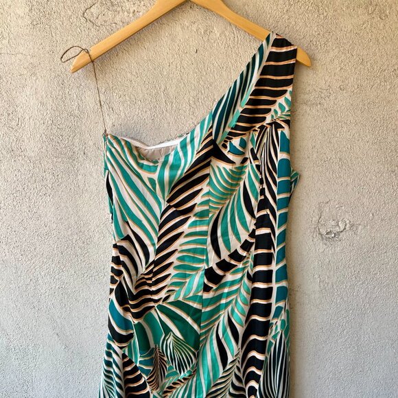 NEW Maggy London One Shoulder Asymmetrical Midi Dress Leafy Jungle Tropical