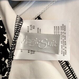 Elevate your swimwear game with this MagicSuit by Miraclesuit tankini top, designed to smooth, shape, and stun. Featuring a chic black-and-white abstract print, a sleek high-neck silhouette, and a functional front zip for customizable coverage, this piece blends confidence-boosting fit technology with runway-worthy style.