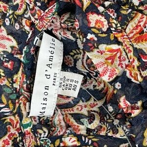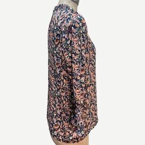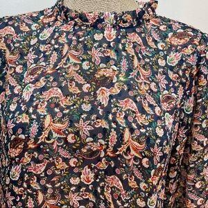 New without tags! Navy semi sheer background with a swiss dot detail. Paisley print. Ruffle collar. Smocked cuffs. Keyhole back.