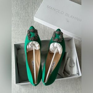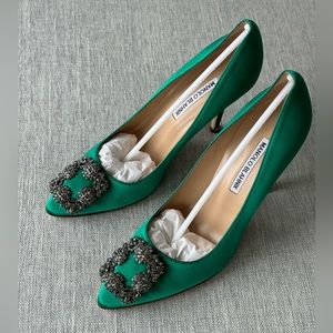 Manolo Blahnik HANGISI Green Satin Jewel Buckle Pumps, retails for US$1,195.00. New in box. Comes with dust bag.