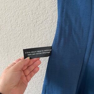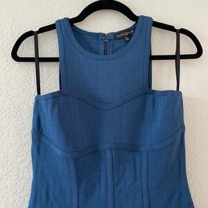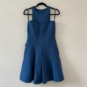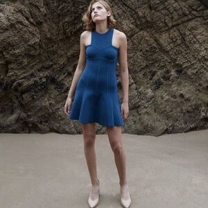 Description: gorgeous blue knit dress with a unique neckline and flattering flared a-line skirt. Mariam Anna Barska worked with, and was responsible for the Hervé Leger revamp. This knit fabric is of the same.