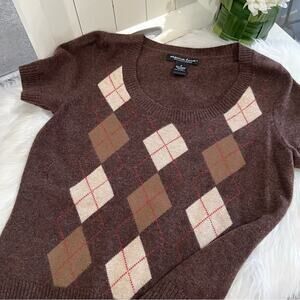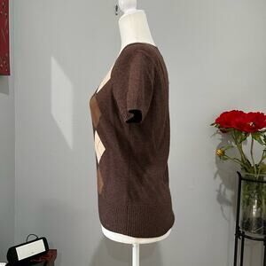 New without tags Gorgeous Timeless and Classic Italian Cashmere Argyle Short Sleeve Scoop Neck Preppy Layering Sweater by Marina Luna Italy. Rich Heather Chocolate Brown with Tan, Cream and Red. Incredibly Soft Mid Weight Cashmere. Ribbed Hem. Size Small.