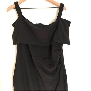 This is the perfect little black dress that gathers at the side accentuate the waist in a flattering silhouette. Has elastic shoulder straps as well as off the shoulder wings to create a gorgeous structural masterpiece. Perfect for formal events, mother of the bride, mother of the groom, black tie.