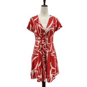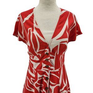 MSRP $138.00 - Short sleeve V neck A line mini dress. Shade of red with an ivory tropical retro pattern. Buttons down the front with a clasp at the neckline. 2 side pockets. Elastic on back of waist. 54% Hemp, 44% Tencel Lyocell & 2% Spandex. Boho, bohemian, party, going out, travel, vacation, Hawaiian, Hawaii, Aloha, dressy casual, date night