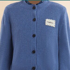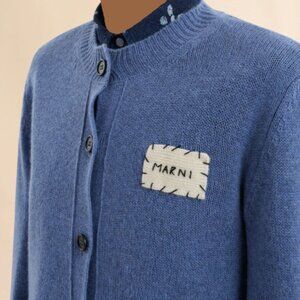 Long-sleeved cardigan knitted. Regular fit with balloon sleeves and round neck. Hand-embellished with a Marni mending logo patch on the chest. Made in Italy