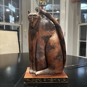 NEW Marsha McCarthy Rare HTF Fat Cat Feline Sculpture Statue Bronze Bedside Table Lamp 22”. Heavy Rectangular Base with Leaf Design. Takes a 40 Watt Lightbulb. (Does Not Come With Lightbulb or Lamp Shade).
