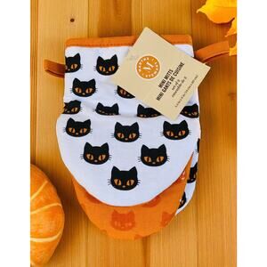 Celebrate Halloween in style with these mini oven mitts featuring spooky black cats with glowing orange eyes and noses.