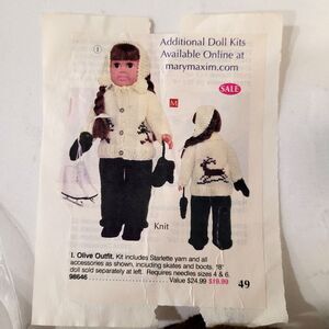 New Mary Maxim Olive Doll Outfit Kit with NO PATTERN. Fits 18" dolls American Girl or other. See below and pics for details.