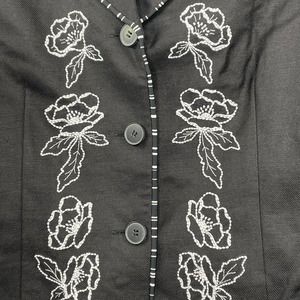 This beautiful Mary McFadden blazer is crafted from a black linen blend fabric with a stunning floral embroidered design, perfect for adding a touch of elegance to any outfit. The mid-length jacket features long sleeves, a collared neckline, and a single-breasted button closure for a classic look.
