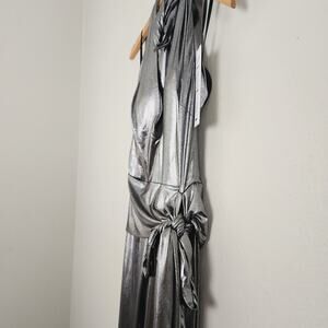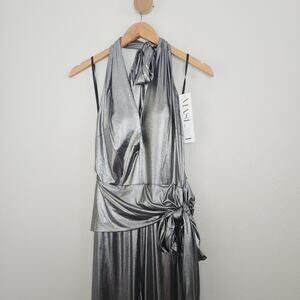 This Maslavi Jovani Silver Metallic Wide Leg Jumpsuit is a show-stopping, NEW with Tags (NWT) statement piece