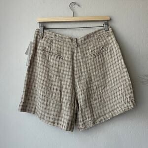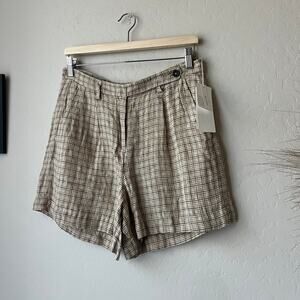 Massimo Alba Sardina tailored shorts in white, tan, gray, and black plaid. 100% linen. Pleated front. High rise. Front slash pockets. Back welt pockets. Zip fly with button tab closure. Made in Italy.