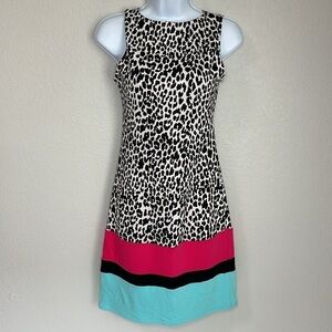 Matching Mommy & Me Dress Open Back Sleeveless Animal Print Dress. Black & white animal print with a pink and blue band. High neck.