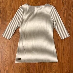 Gray and white striped tee. 3/4 length sleeves. Style# 26679T